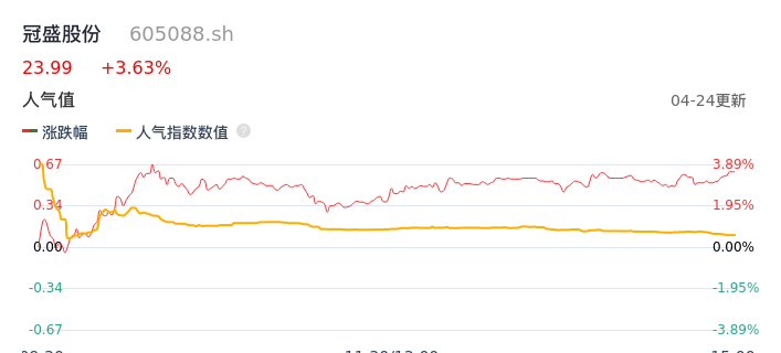 04月24日,冠盛股份收报23.99,股价涨幅3.63%,成交金额1.47亿元,换手率3.63%。
