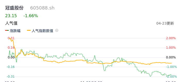 04月23日,冠盛股份收报23.15,股价涨幅-1.66%,成交金额1.18亿元,换手率2.97%。