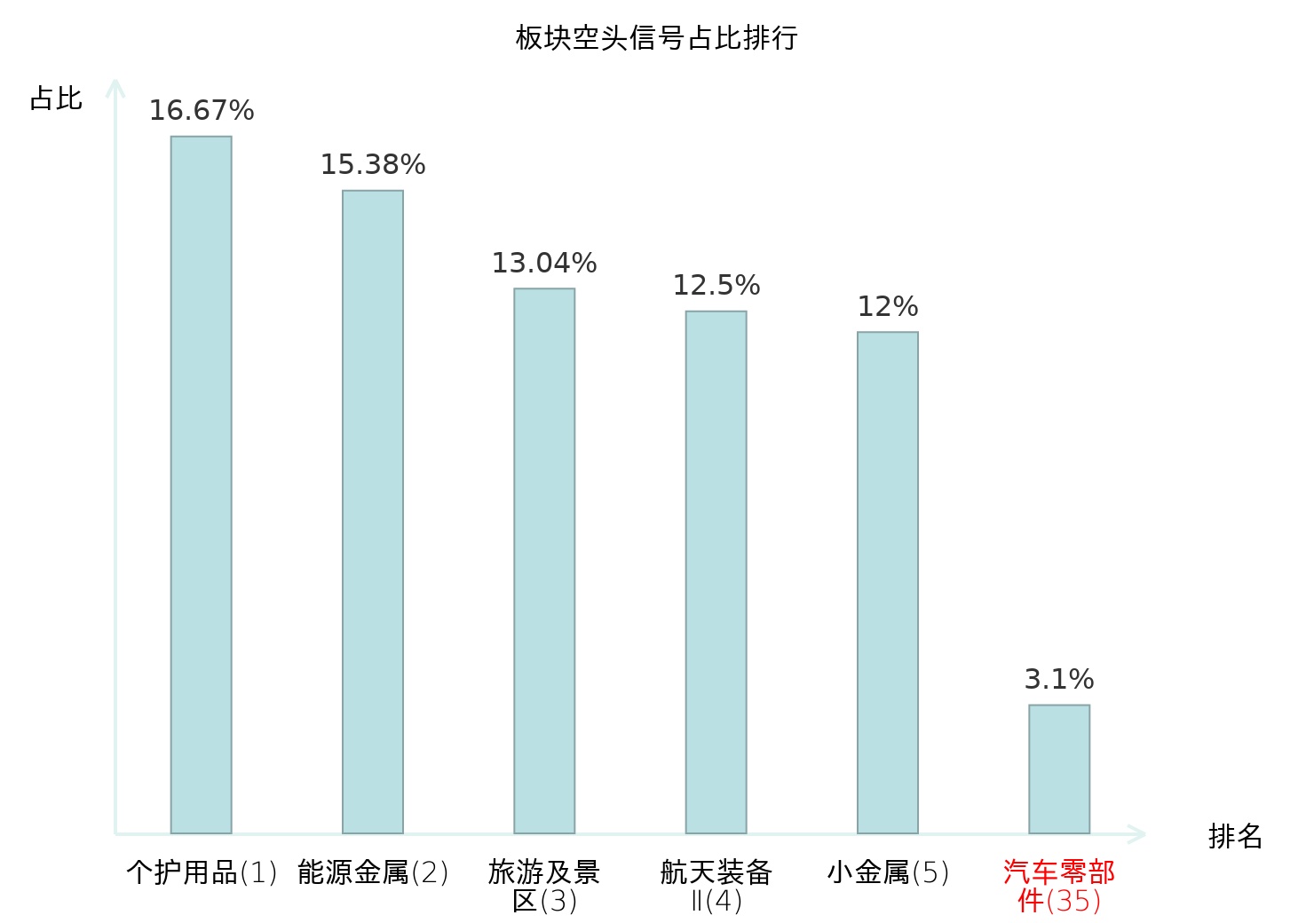 全市场所有行业板块中主力空头信号占比排名中,个护用品板块位居第一。元件板块名次提升最快,较昨日上升106位。