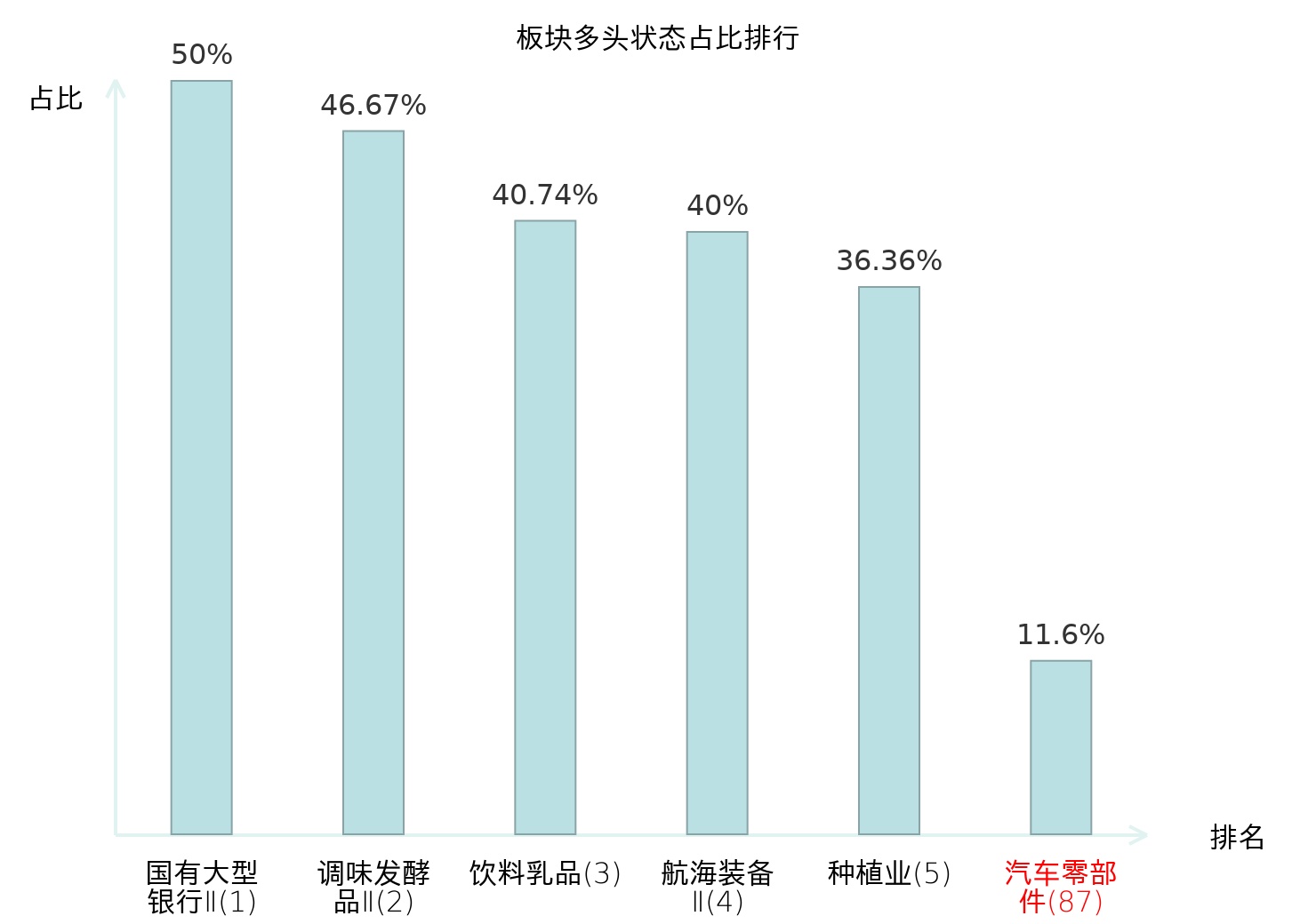 全市场所有行业板块中主力多头状态占比排名中,国有大型银行Ⅱ板块位居第一。金属新材料板块名次提升最快,较昨日上升71位。