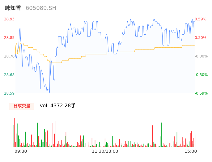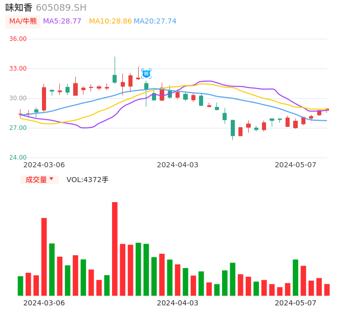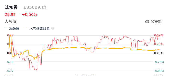 05月07日,味知香收报28.92,股价涨幅0.56%,成交金额1259.82万元,换手率0.32%。
