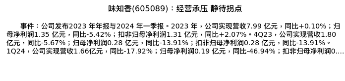 值得注意的是:2024年05月中泰证券的范劲松/晏诗雨/熊欣慰分析师,首次发布关于味知香的研究报告,标题为:味知香(605089):经营承压 静待拐点。