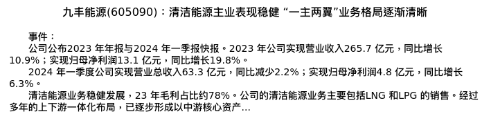 值得注意的是:2024年05月天风证券的郭丽丽/张樨樨分析师,首次发布关于九丰能源的研究报告,标题为:九丰能源(605090):清洁能源主业表现稳健 “一主两翼”业务格局逐渐清晰。