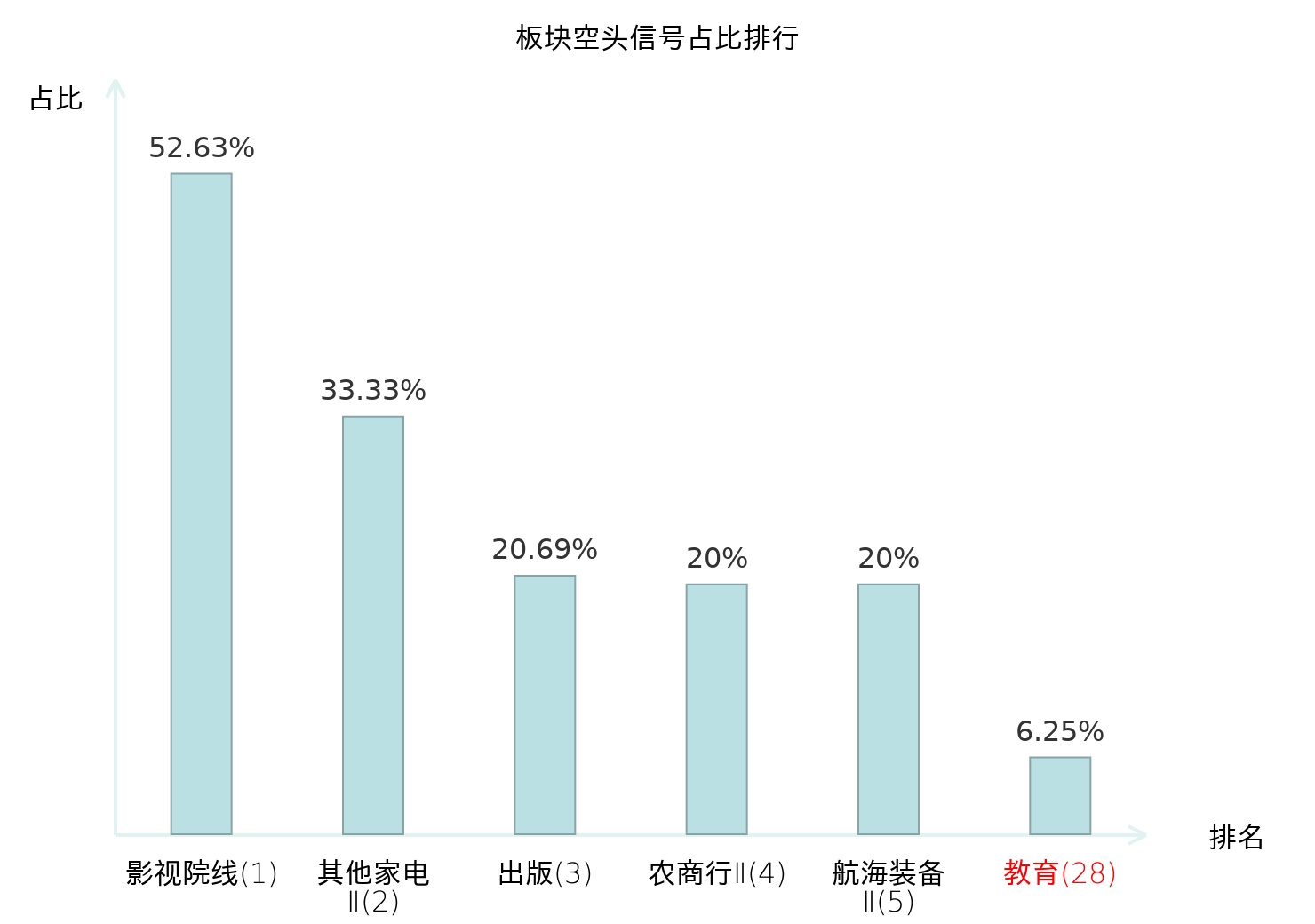 全市场所有行业板块中主力空头信号占比排名中,影视院线板块位居第一。出版板块名次提升最快,较昨日上升115位。