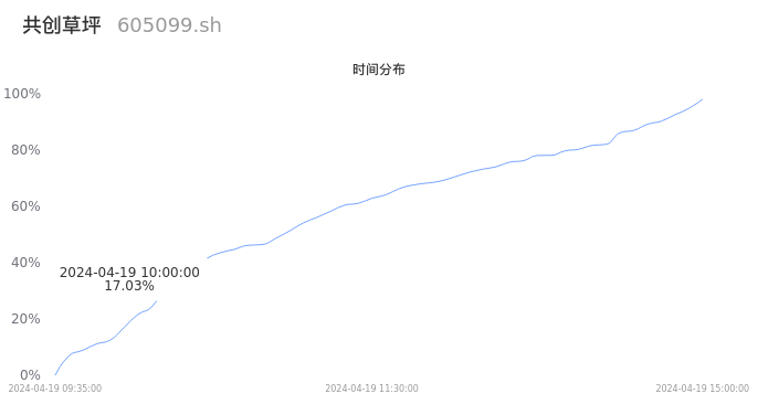 605099共创草坪2024年04月19日成交5550手,成交金额1165.58万元,相较昨日缩量217手,换手率0.14%,成交清淡。