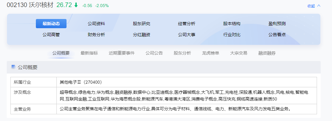 今天为大家带来的是沃尔核材,我们先来了解一下这家公司是做什么的,我们通过公司概要可以清楚的看到:公司所属行业是其他电子。