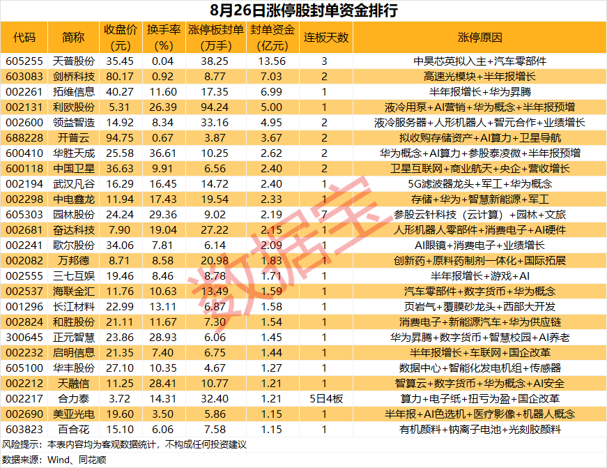 以封单金额计算,30股封单资金均超1亿元,天普股份、剑桥科技、拓维信息封单资金居前,分别为13.56亿元、7.03亿元、6.99亿元。