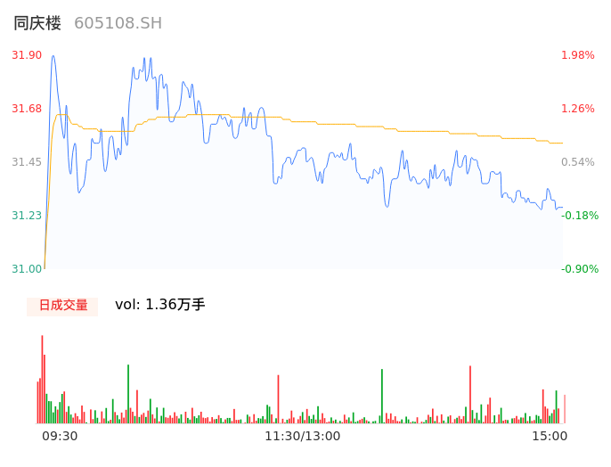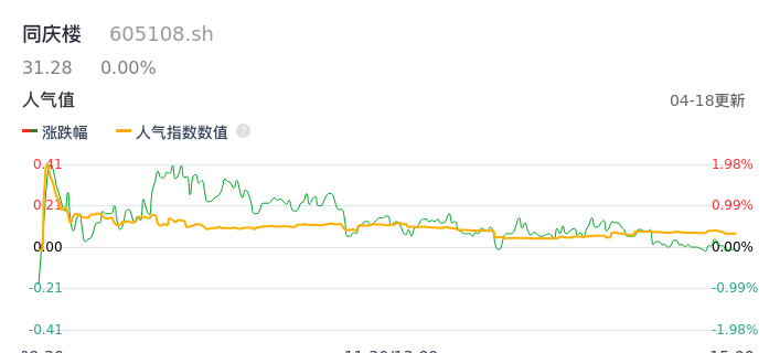04月18日,同庆楼收报31.28,股价涨幅0.00%,成交金额4328.74万元,换手率0.53%。