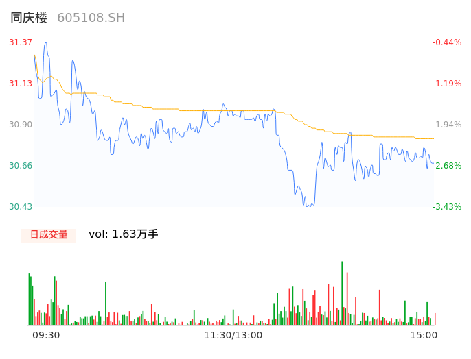 04月23日,同庆楼收报30.73,股价涨幅-2.48%,成交金额5022.18万元,换手率0.63%。