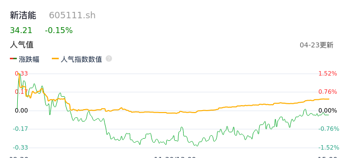 04月23日,新洁能收报34.21,股价涨幅-0.15%,成交金额1.47亿元,换手率1.45%。