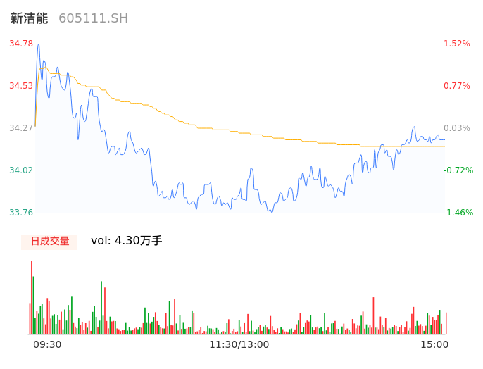 04月23日,新洁能收报34.21,股价涨幅-0.15%,成交金额1.47亿元,换手率1.45%。