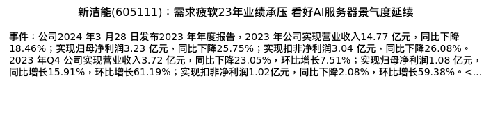 值得注意的是:2024年04月长城证券的邹兰兰分析师,首次发布关于新洁能的研究报告,标题为:新洁能(605111):需求疲软23年业绩承压 看好AI服务器景气度延续。