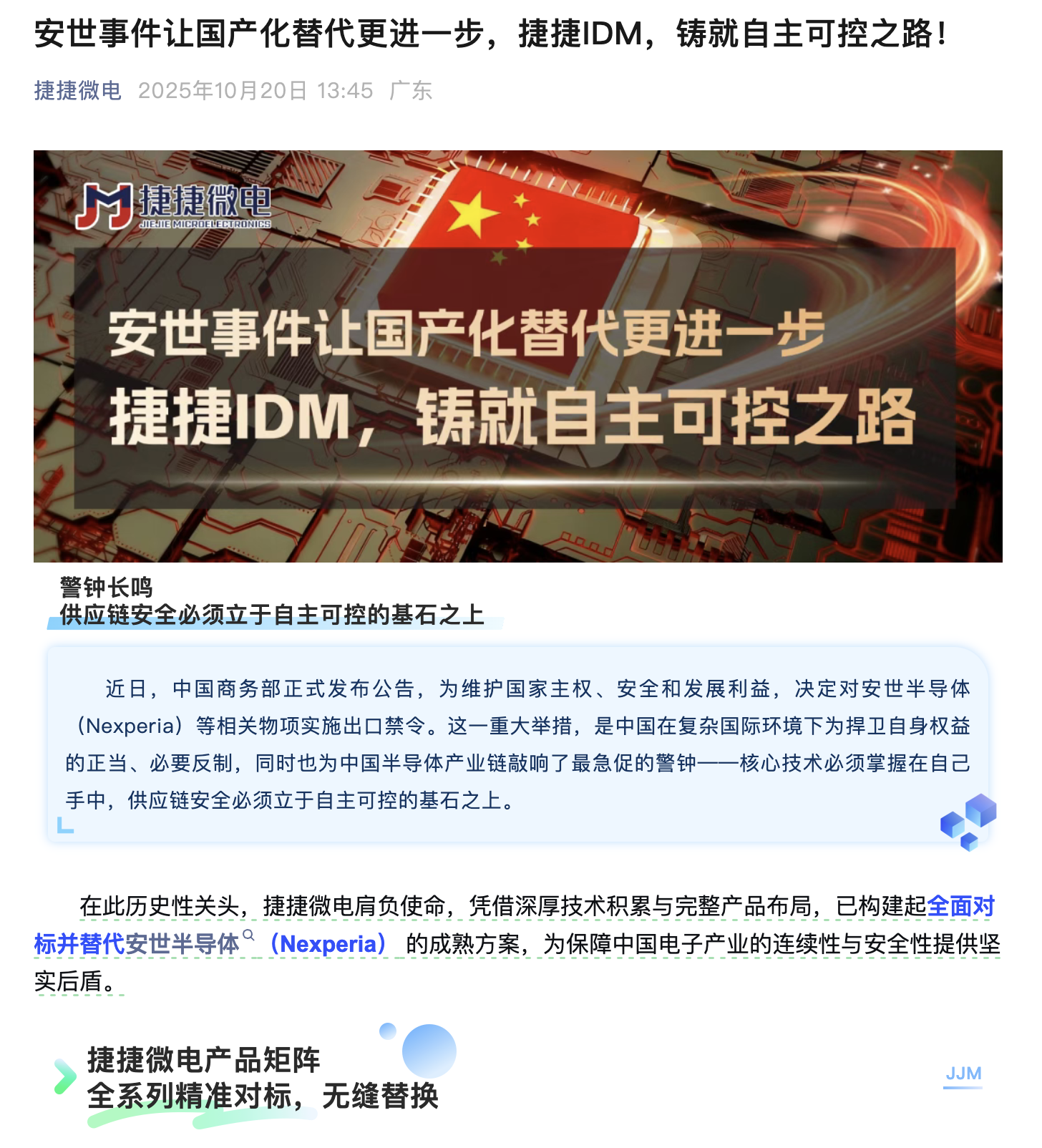 捷捷微电今日(10月20日)通过其官方渠道发文称,捷捷微电凭借深厚技术积累与完整产品布局,已构建起全面对标并替代安世半导体(Nexperia) 的成熟方案。