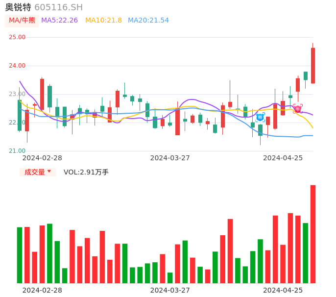 04月25日,奥锐特收报24.62,股价涨幅4.77%,成交金额7067.01万元,换手率0.74%。
