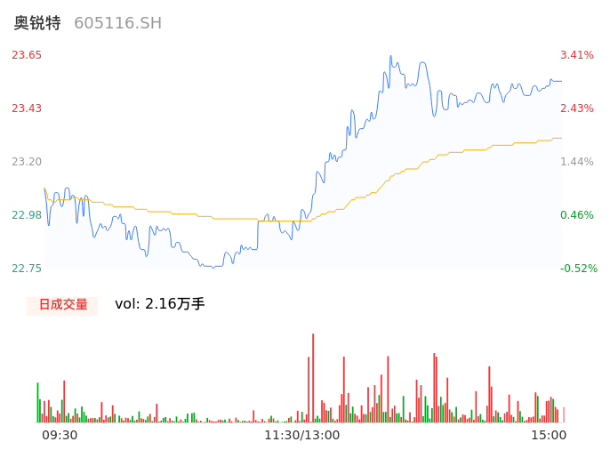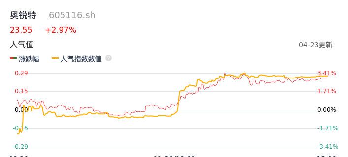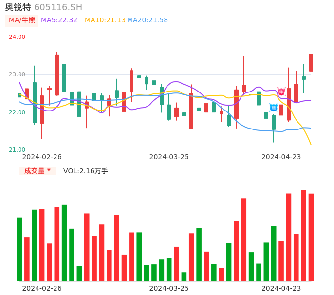 04月23日,奥锐特收报23.55,股价涨幅2.97%,成交金额5032.90万元,换手率0.55%。