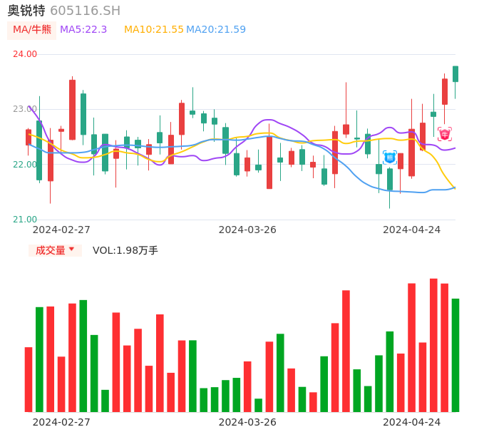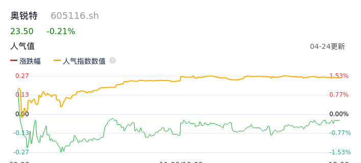 04月24日,奥锐特收报23.50,股价涨幅-0.21%,成交金额4622.00万元,换手率0.50%。