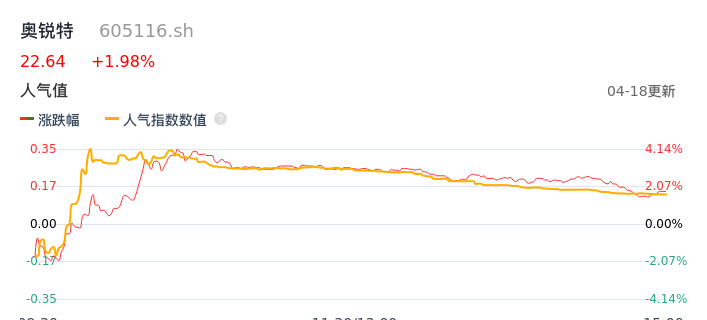 04月18日,奥锐特收报22.64,股价涨幅1.98%,成交金额4903.40万元,换手率0.55%。