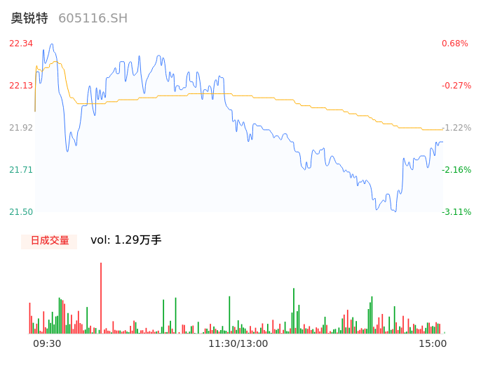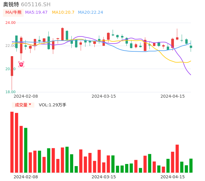 04月15日,奥锐特收报21.83,股价涨幅-1.62%,成交金额2823.02万元,换手率0.33%。