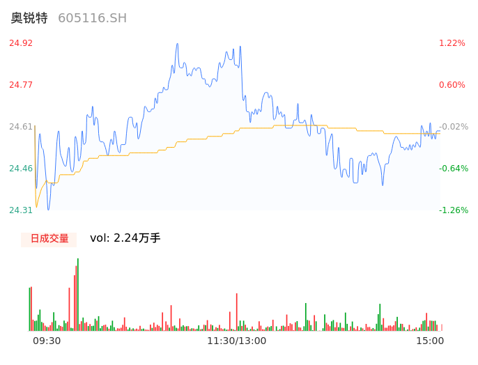04月26日,奥锐特收报24.64,股价涨幅0.08%,成交金额5500.18万元,换手率0.57%。