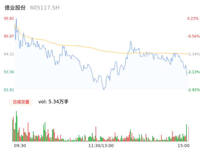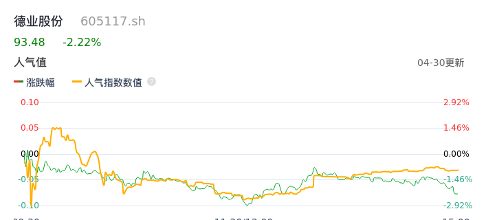 04月30日,德业股份收报93.48,股价涨幅-2.22%,成交金额5.04亿元,换手率1.24%。