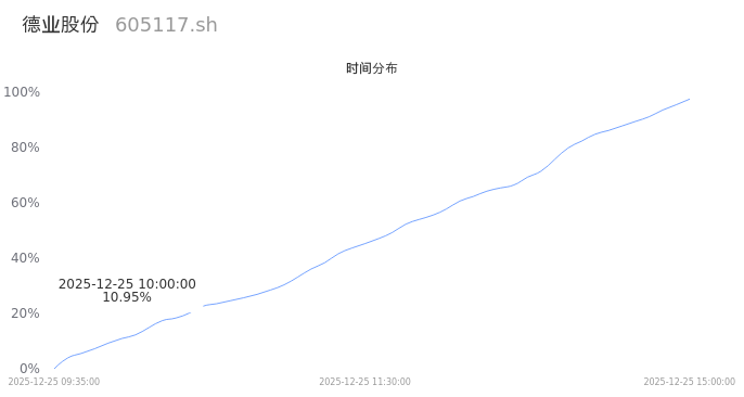 605117德业股份2025年12月25日成交9.81万手,成交金额8.63亿,相较昨日放量1.15万手,换手率1.08%,成交清淡。