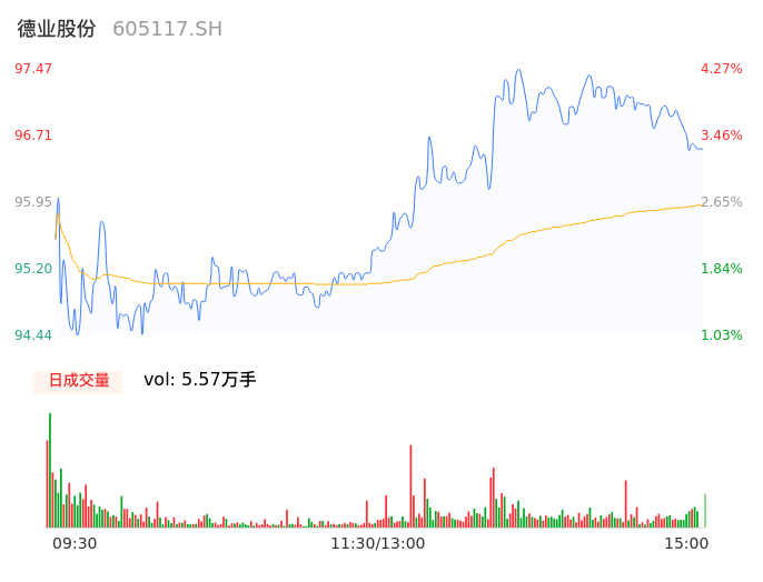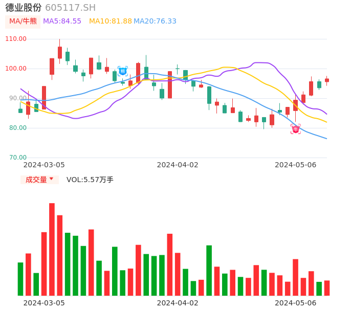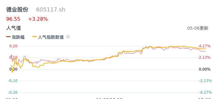 05月06日,德业股份收报96.55,股价涨幅3.28%,成交金额5.34亿元,换手率1.29%。