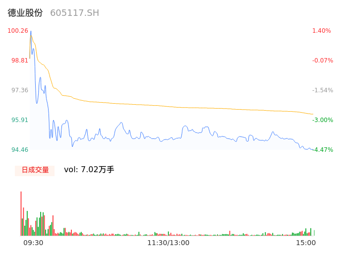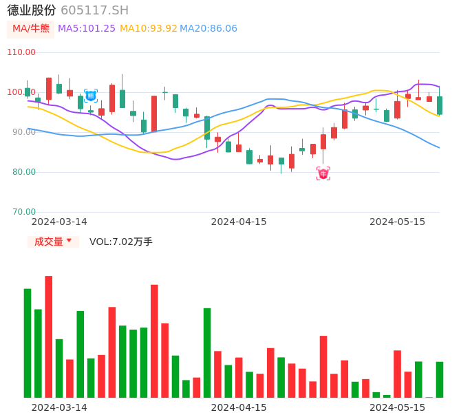 05月15日,德业股份收报94.46,股价涨幅-4.47%,成交金额6.75亿元,换手率1.63%。