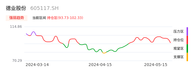 我们来看一下该股的九方特色指标强弱趋势的情况:德业股份自04月25日从观望区上穿到持仓区。股价近期在多头区域回调整理。后续重点关注多空分界点的争夺:93.73元。如未能有效站稳则可能重新回到空头行情。