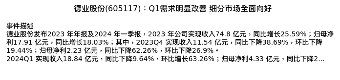 值得注意的是:2024年05月长江证券的邬博华/曹海花分析师,首次发布关于德业股份的研究报告,标题为:德业股份(605117):Q1需求明显改善 细分市场全面向好。