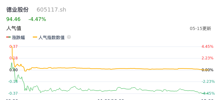 05月15日,德业股份收报94.46,股价涨幅-4.47%,成交金额6.75亿元,换手率1.63%。