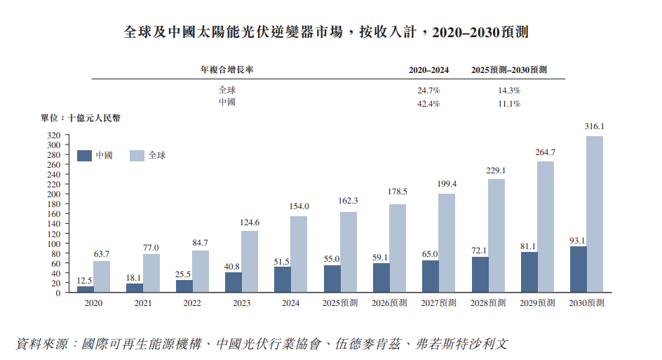受碳中和与能源转型政策驱动,全球太阳能光伏逆变器市场按收入计从2020年的637亿元人民币增长至2024年的1,540亿元人民币,复合年增长率达24.7%。同期中国市场收入从125亿元人民币扩大至515亿元人民币,复合年增长率达42.4%。随着全球光伏装机持续推进,市场规模预计将保持稳健增长。到2030年,全球和中国市场规模预计将分别达到3,161亿元人民币和931亿元人民币,2025至2030年期间的复合年增长率分别为14.3%和11.1%。