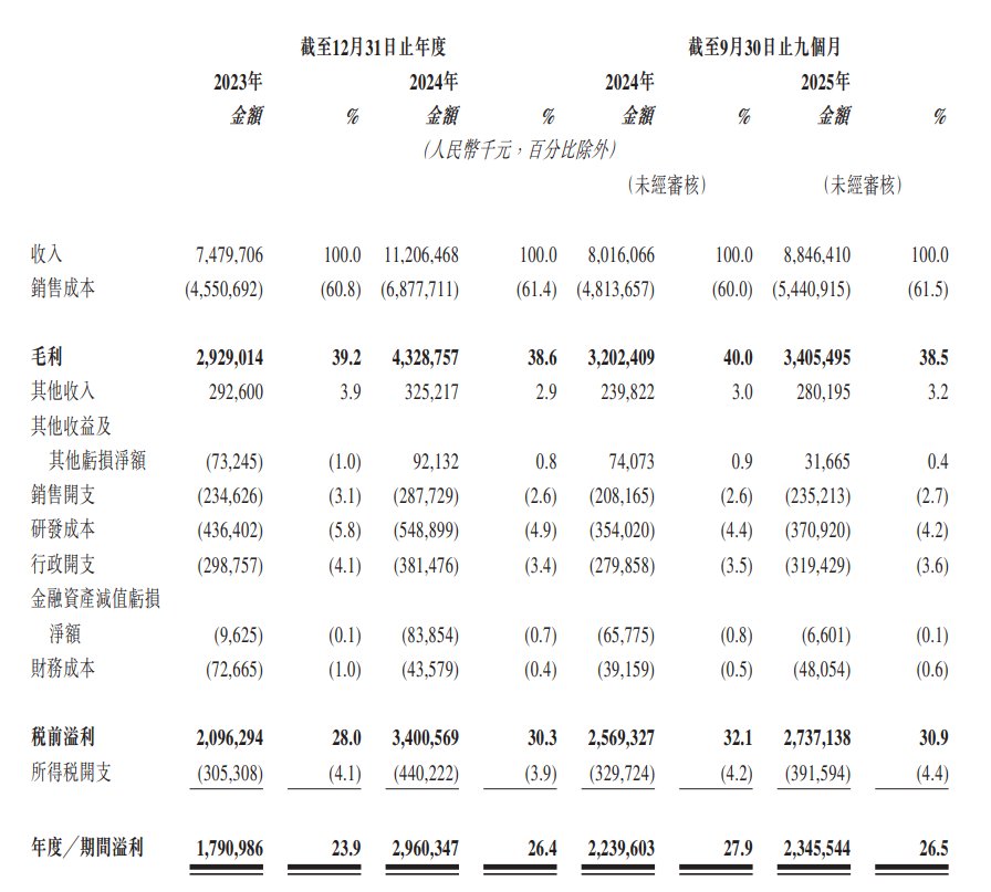 于2023年度、2024年度、2025年截至9月30日止九个月,公司分别录得年度╱期间溢利约为人民币17.91亿元、29.6亿元、23.46亿元。