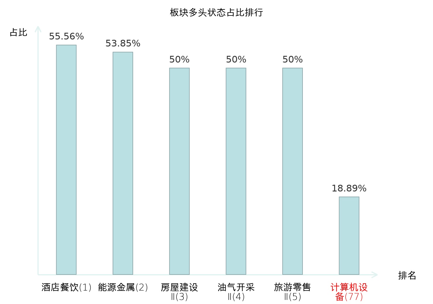 全市场所有行业板块中主力多头状态占比排名中,酒店餐饮板块位居第一。饰品板块名次提升最快,较昨日上升84位。