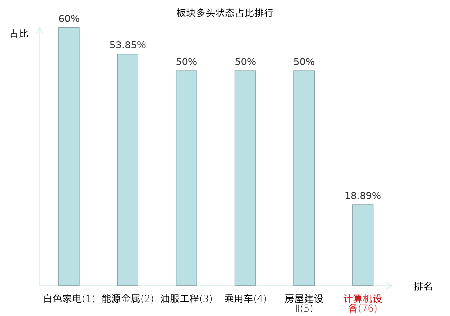 全市场所有行业板块中主力多头状态占比排名中,白色家电板块位居第一。油气开采Ⅱ板块名次提升最快,较昨日上升45位。