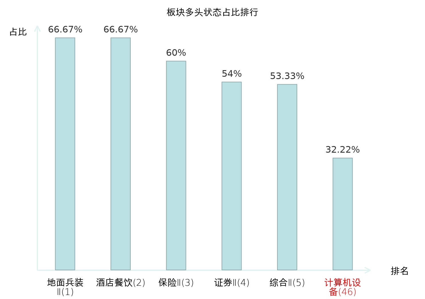 全市场所有行业板块中主力多头状态占比排名中,地面兵装Ⅱ板块位居第一。计算机设备板块名次提升最快,较昨日上升48位。