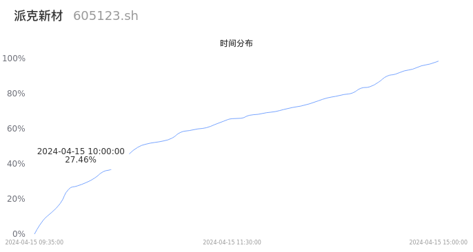 根据成交分布分析,该股票当天放量成交,成交清淡。时间上看,早盘前半小时成交量占据当天总成交量的27.46%;价格上看,成交呈现中间峰。成交分布分析主要研究股票成交的分布特性,不具有预测功能,请知悉。