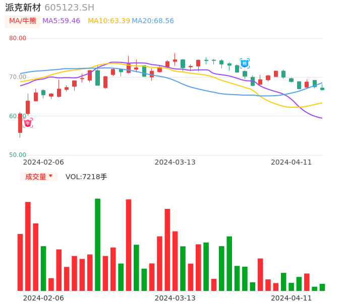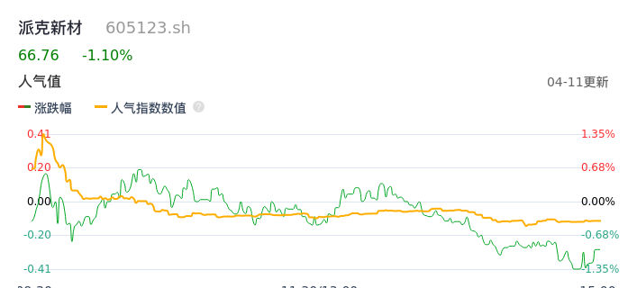 04月11日,派克新材收报66.76,股价涨幅-1.10%,成交金额4856.18万元,换手率0.60%。