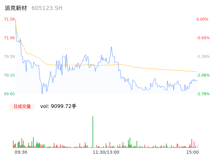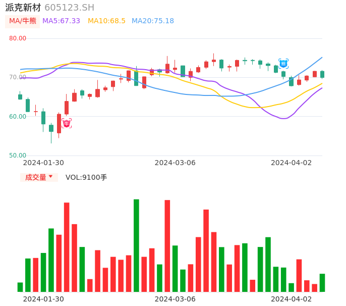 04月02日,派克新材收报69.96,股价涨幅-2.28%,成交金额6387.37万元,换手率0.75%。
