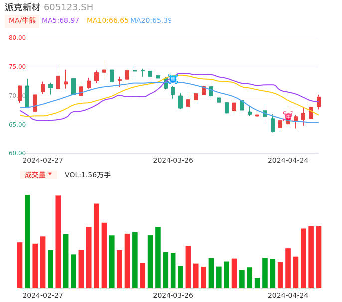 04月24日,派克新材收报69.79,股价涨幅2.57%,成交金额1.08亿元,换手率1.28%。