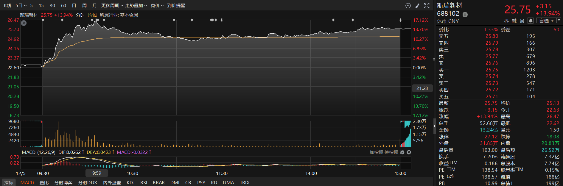 斯瑞新材周四发布机构调研纪要表示,公司液体火箭发动机推力室产品收入2025年1-6月保持较快增长,客户覆盖蓝箭航天、九州云箭等国内主要的商业航天领先企业。2024年,公司启动了液体火箭发动机推力室材料、零件、组件产业化项目,一阶段预计达产后将实现年产约200吨锻件、200套火箭发动机喷注器面板、500套火箭发动机推力室内壁、外壁等零组件。二级市场上,斯瑞新材周五收盘涨近14%。