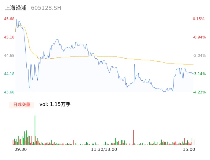 04月15日,上海沿浦收报44.21,股价涨幅-3.07%,成交金额5088.83万元,换手率1.43%。