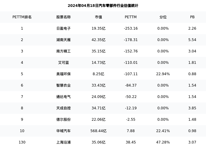 上海沿浦最新报告期数据为年报,下表汇总了汽车零部件行业内市值靠前的公司年报主要经营数据