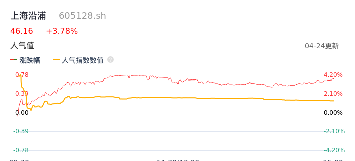 04月24日,上海沿浦收报46.16,股价涨幅3.78%,成交金额3763.54万元,换手率1.03%。