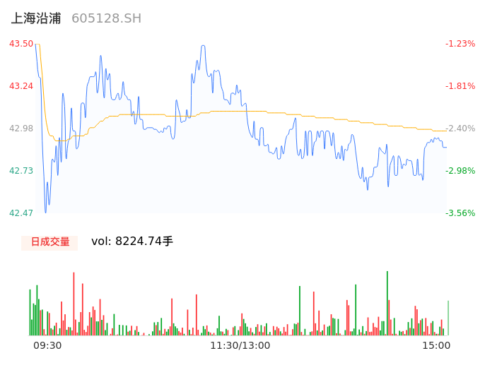 04月22日,上海沿浦收报42.86,股价涨幅-2.68%,成交金额3534.29万元,换手率1.03%。