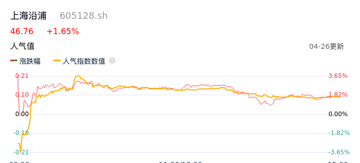 04月26日,上海沿浦收报46.76,股价涨幅1.65%,成交金额4532.74万元,换手率1.21%。