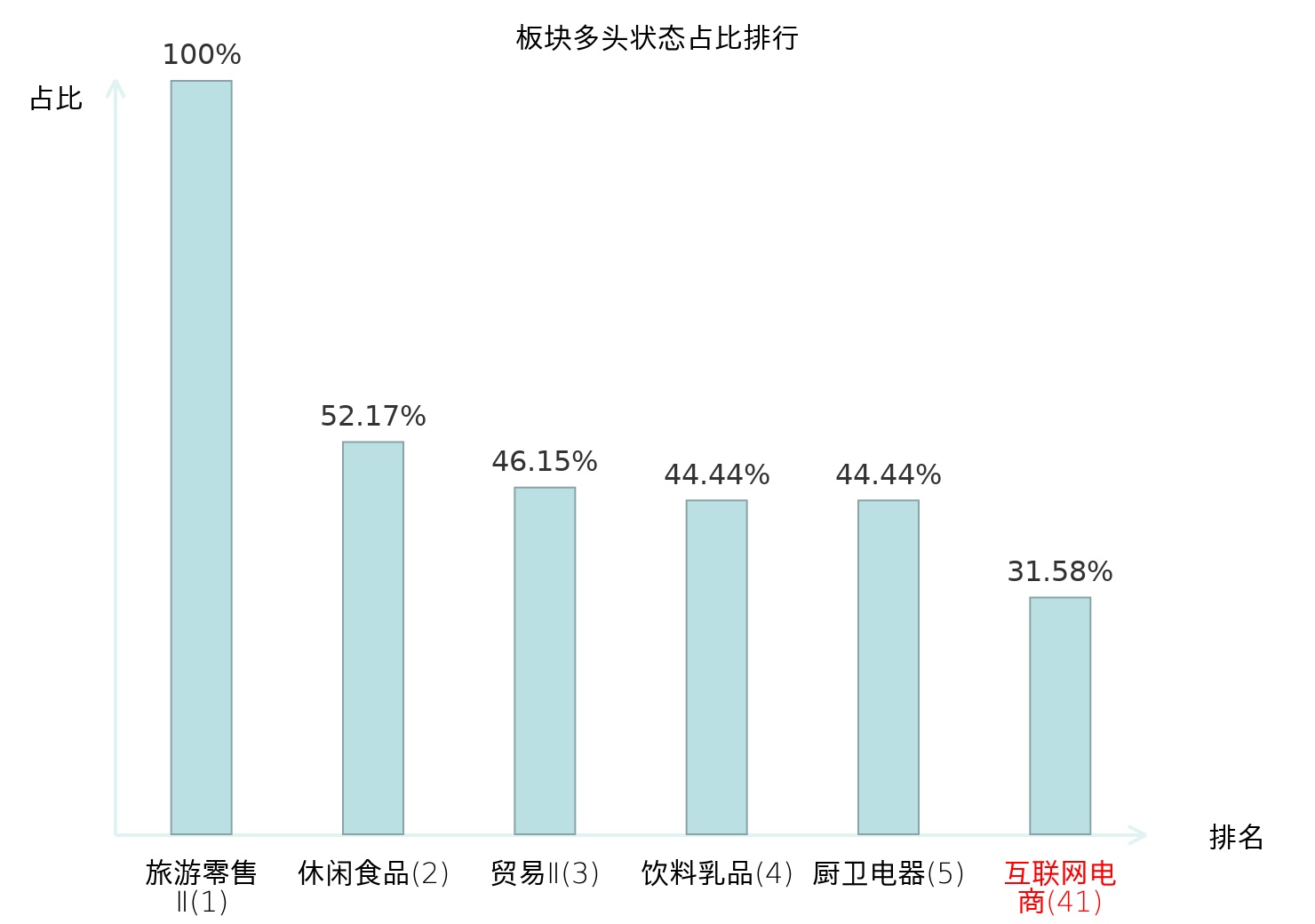 全市场所有行业板块中主力多头状态占比排名中,旅游零售Ⅱ板块位居第一。乘用车板块名次提升最快,较昨日上升91位。