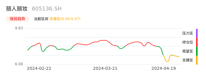 我们来看一下该股的九方特色指标强弱趋势的情况:丽人丽妆自04月15日进入支撑区。股价出现一波快速下跌行情,目前下跌动能仍未衰竭。建议继续谨慎观望。注意今日下方支撑位:6.08元,如有效跌破将可能出现新一轮下跌。