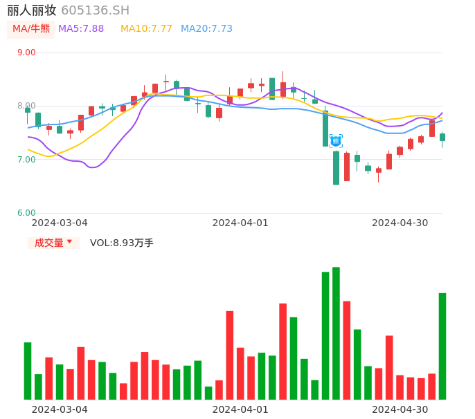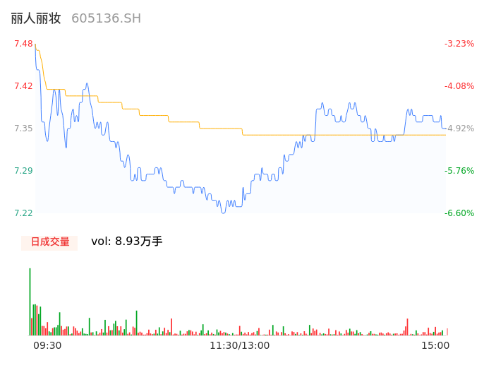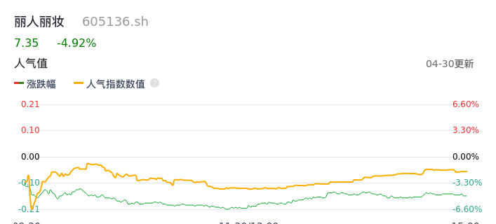 04月30日,丽人丽妆收报7.35,股价涨幅-4.92%,成交金额6557.54万元,换手率2.23%。