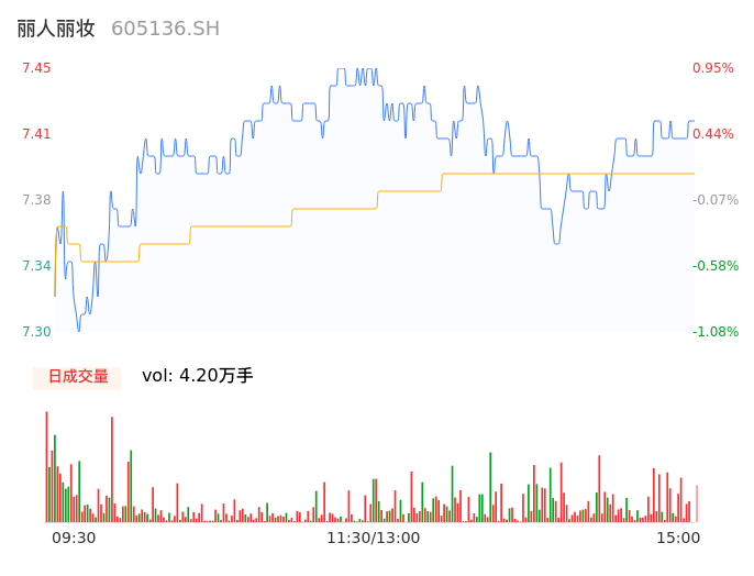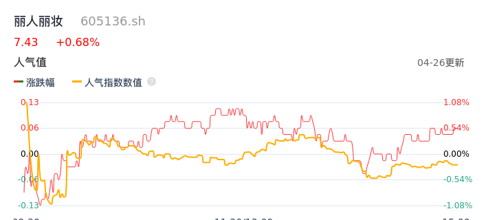 04月26日,丽人丽妆收报7.43,股价涨幅0.68%,成交金额3101.93万元,换手率1.05%。