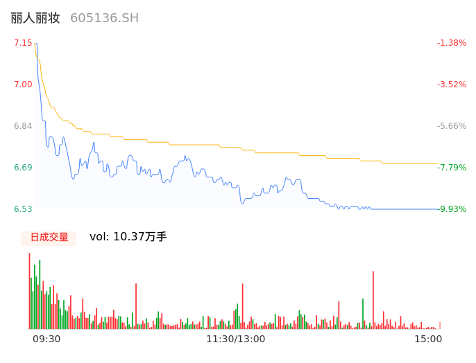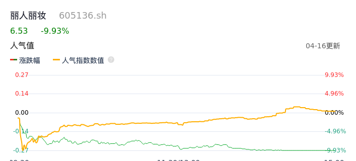 04月16日,丽人丽妆收报6.53,股价涨幅-9.93%,成交金额6943.16万元,换手率2.59%。